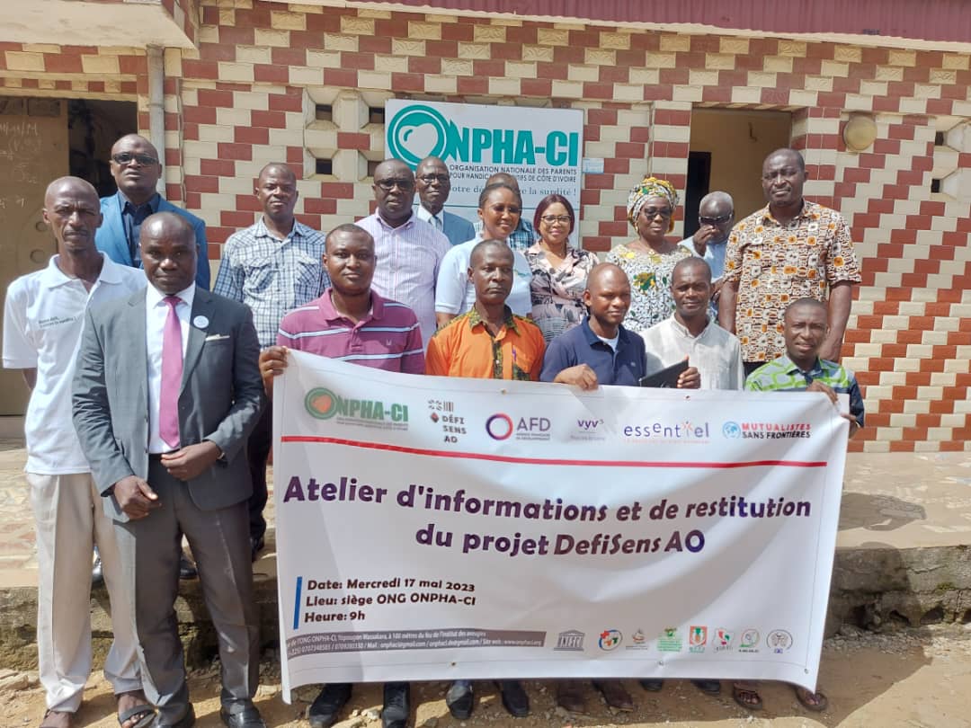 Porté en consortium par Mutualistes Sans Frontières Solidarité, VYV3 Pays de la Loire et ESSENTIEL et soutenu par l’AFD sur la période du 1er janvier 2022 au 31 décembre 2024, le projet DéfiSens’AO implique 15 organisations couvrant 7 pays qui sont le Benin, le Burkina Faso, le Togo, le Niger, le Mali, la France et la Côte d’Ivoire dont les Ong ONPHA-CI et la Fédération des Aveugles et Mouvements Associés de Côte d’Ivoire sont les partenaires.