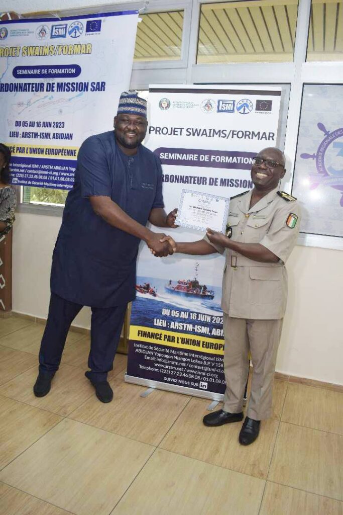 Ce stage est organisé dans le cadre du projet SWAIMS (« Support to West Africa Integrated Maritime Security ») de la CEDEAO et avec le soutien financier de l’Union Européenne. Prenant la parole au terme de cette formation, le Directeur de l’ISMI, le Colonel Abé Aké Lazare, s’est réjoui de la montée en puissance de cet outil que constitue l’Ecole SAR.