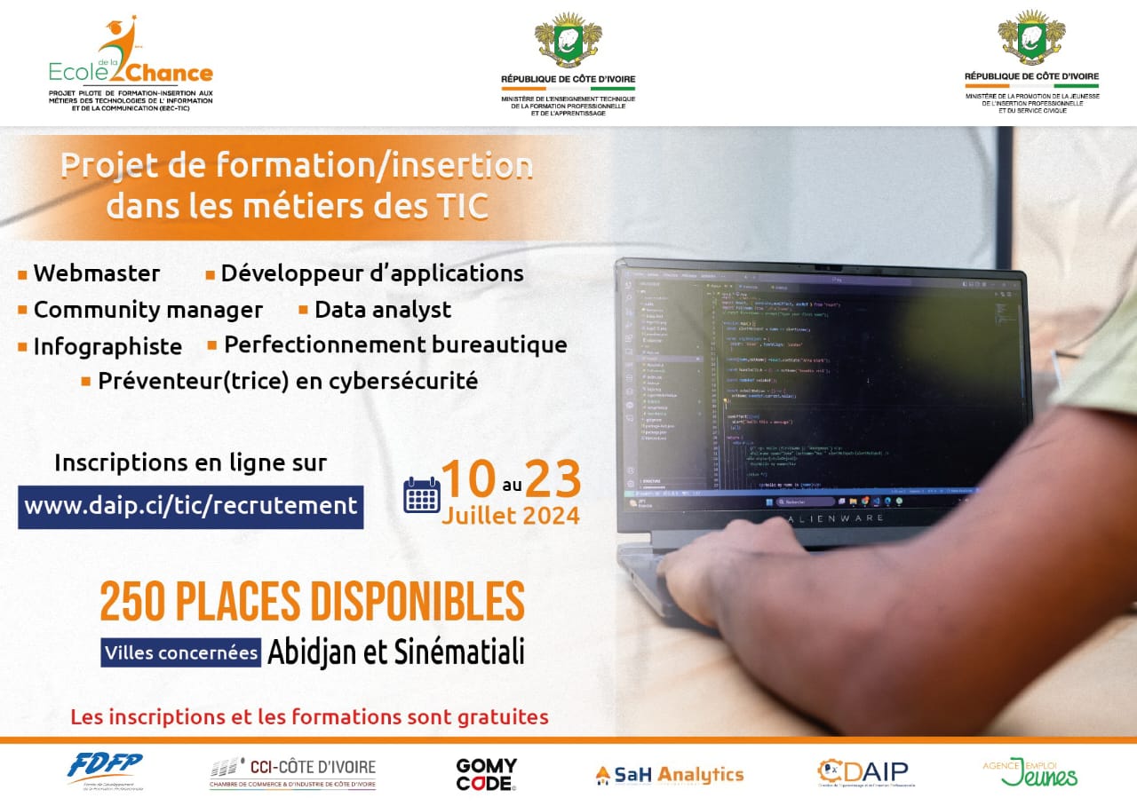 Ce projet concerne sept (7) métiers des Technologies de l’Information et de la Communication (TIC) dans les villes d’Abidjan et de Sinématiali. Un appel à candidatures a été lancé par le ministère de l’Enseignement technique, pour le recrutement d’une première vague de deux cent cinquante (250) personnes selon le tableau suivant : Webmaster 25 places, Community manager 40, Infographiste 40. Pour ces trois (3) métiers, les niveaux exigés sont le BAC (toutes séries)) et BT (toutes options).