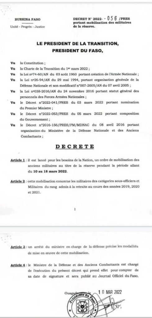 Pour les besoins de la Nation burkinabé, le Président de la Transition, Paul Henri Damiba, a signé un décret, le 10 mars 2022, portant ordre de mobilisation des anciens militaires au titre de la réserve pendant la période allant du 10 au 18 mars 2022.
