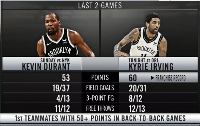 Marquer plus de 50 points est un petit exploit en NBA, mais les Nets ont au moins deux joueurs capables de cette prouesse. Une première dans l’histoire pour ce duo, qui pourrait remettre ça d’ici la fin de saison, d’autant que Brooklyn en a bien besoin. En attendant, on peut apprécier cette belle victoire sur Orlando.