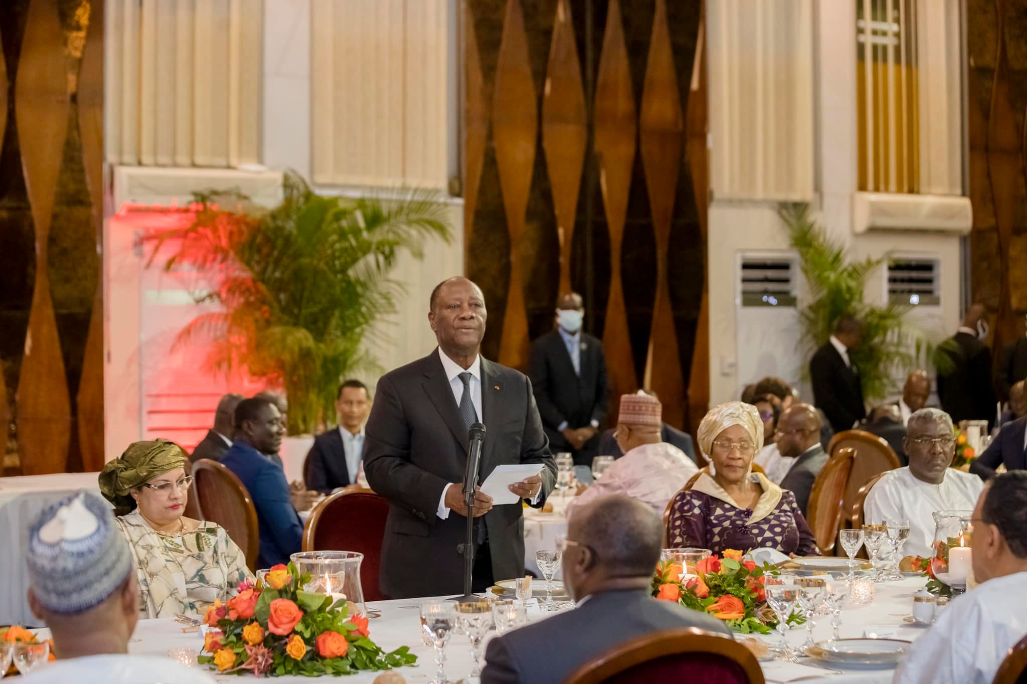 Je vous invite à présent à vous lever et à lever vos verres en l’honneur de Son Excellence Monsieur Mohamed BAZOUM, Président de la République du Niger, de Madame Hadidja BAZOUM, Première Dame de la République du Niger et de l’importante délégation qui l’accompagne, de même qu’à l’amitié et à la fraternité entre les peuples ivoirien et nigérien.