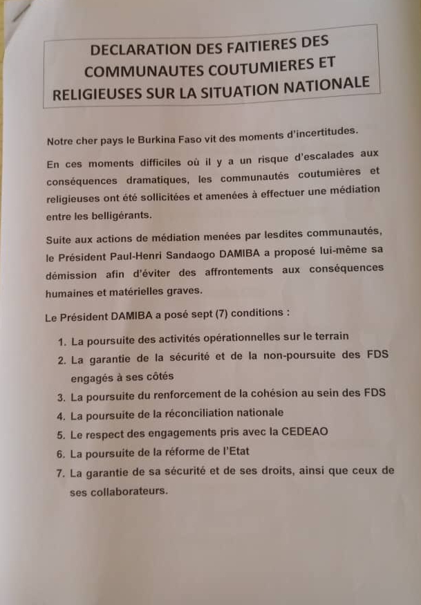 Les faîtières des Communautés coutumières et religieuses du Burkina Faso ont produit une déclaration suite à leur médiation dans la crise entre militaires qui secoue leur pays. Dans cette déclaration dont Le Mandat a reçu copie, le Président Damiba a posé sept (07) conditions pour quitter le pouvoir, lesquelles conditions ont été acceptées par l’actuel homme fort, le capitaine Ibrahima Traoré.