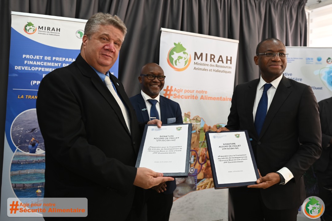 Le ministre des Ressources Animales et Halieutiques, représentant le Gouvernement de Côte d’Ivoire, et le représentant pays résident de l’Organisation des Nations unies pour l’alimentation et l’agriculture (FAO), Samy Gaiji, ont procédé, mercredi 26 octobre, à Abidjan à la signature d’une convention. Le montant global de cet accord est estimé à 700 000 Euros, soit 455 millions de FCFA, pour la mise en œuvre des études visant à élaborer un cadre stratégique pour l’Économie Bleue (CASUEB) et la préparation d’un Plan National d’Investissement Économie Bleue (PNIEB).