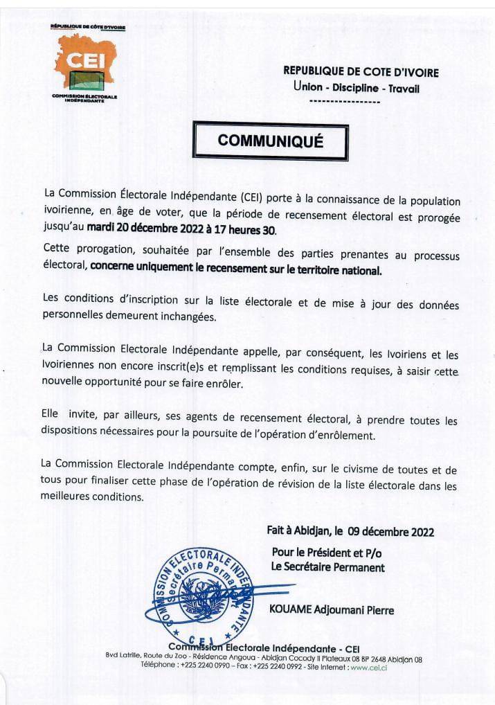 ”La Commission Électorale Indépendante (CEI) porte à la connaissance de la population ivoirienne, en âge de voter, que la période de recensement électoral est prorogée jusqu’au mardi 20 décembre 2022 à 17 heures 30.