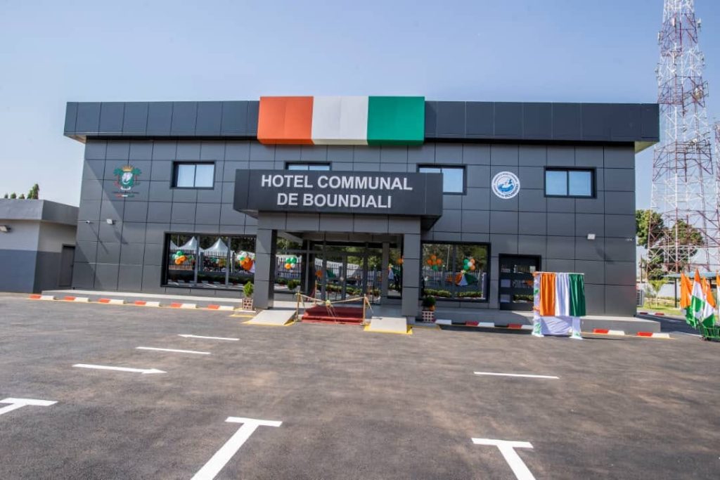 A l’en croire, cet édifice est le symbole de la volonté d’émergence d’une cité de rêve ; et pour la municipalité, la quête d’offrir le meilleur à ses habitants. Notons que l’hôtel communal, bâti à hauteur de 784 550 000 FCFA, et portant le nom de la Première Dame Dominique Ouattara, comprend un bâtiment administratif, un bloc de collecte indépendant, deux parkings, etc. Il est doté également de deux salles de cérémonie, dont la salle de mariage, d’une capacité de de 300 à 500 places.