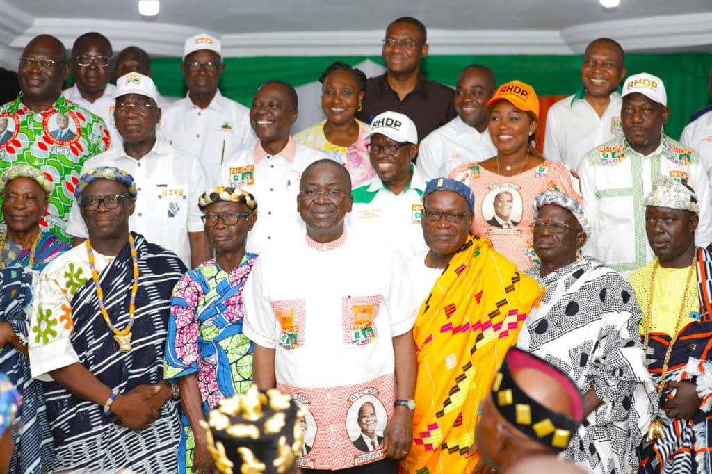 En marge de la présentation des 9 candidats RHDP pour les municipales et régionales dans la région du Gbêkê, le samedi 27 mai 2023, au siège régional du parti à Bouaké, le président du Sénat, Ahoussou Kouadio Jeannot, a rencontré tous les chefs des villages et des cantons du Gbêkê. Ils étaient 800 têtes couronnées à venir écouter l’émissaire du président de la République Alassane Ouattara, dont la mission consistait à présenter officiellement ses lieutenants aux populations. Le président du Sénat s’est indigné du rejet du RHDP par ses parents du Gbêkê.