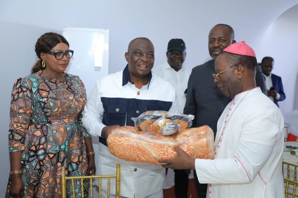 Idem à la l’endroit du vice-président de la Conférence des évêques, Monseigneur Marcellin Kouadio et le Nonce apostolique Mauricio Rueda Beltz qui ont reçu chacun une chaise royale et un pagne de valeur. Ce geste de foi empreinte d’amour a été salué, à sa juste valeur, par le porte-parole des évêques. Au nom de ses pairs, celui-ci a réitéré ses remerciements au couple Adjoumani qui, de son aveu, a posé ces actes malgré la situation de deuil qu’il traverse.