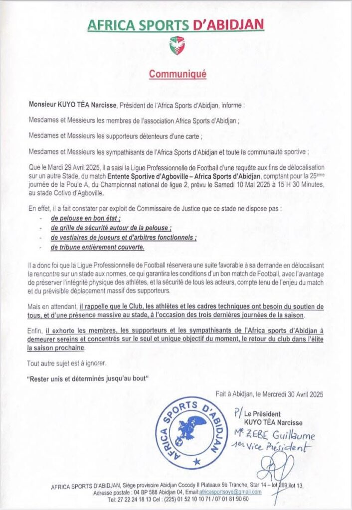Lemandatexpress – L’Africa Sports d’Abidjan, l’un des clubs les plus emblématiques du football ivoirien, a officiellement demandé la délocalisation de son match contre l’Entente Sportive d’Agboville, prévu pour le 10 mai 2025 au stade Cotivo d’Agboville, dans le cadre de la 25e journée de la Poule A du championnat national de Ligue 2.
