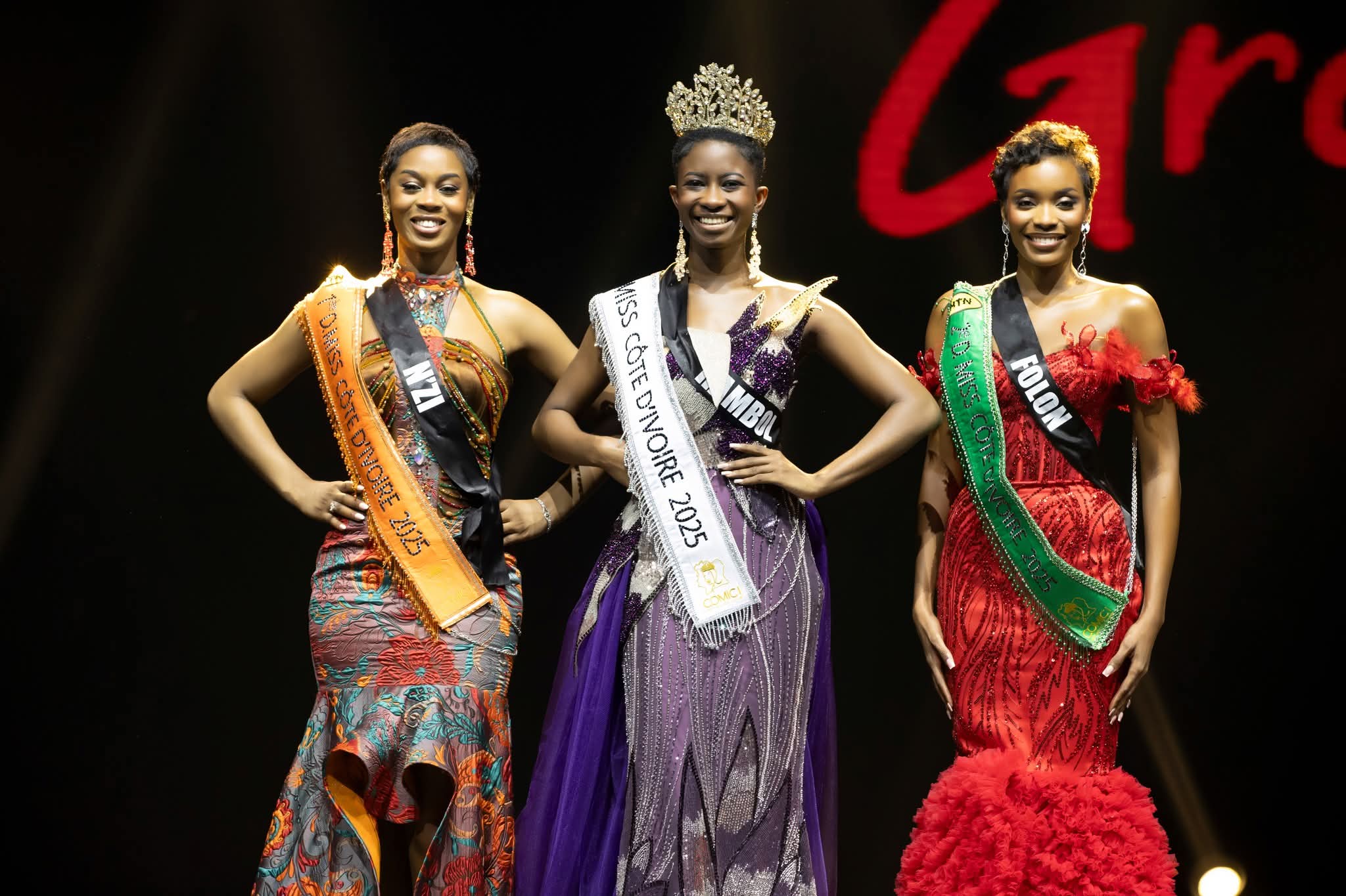 Fatima Koné n’est pas montée seule sur le podium. Elle est accompagnée par Diane Gouano, représentant la région du N’Zi, qui décroche le titre de première dauphine. La troisième marche du podium revient à Marie-Axelle Gbogou, ambassadrice de la région du Folon, sacrée deuxième dauphine.
