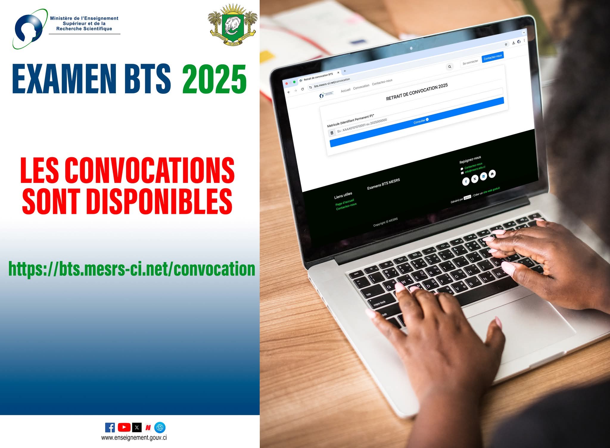Les choses se précisent pour les candidats au BTS 2025. Ce mercredi 9 juillet 2025, le ministère de l’Enseignement supérieur et de la Recherche scientifique a annoncé la mise en ligne des convocations sur le site https://bts.mesrs-ci.net/convocation. Tous les candidats régulièrement inscrits sont invités à y accéder pour imprimer leur document, indispensable pour participer aux épreuves.