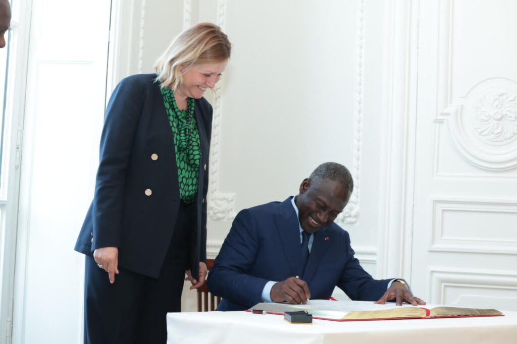 Le Président de l’Assemblée nationale de Côte d’Ivoire, Son Excellence Monsieur Adama BICTOGO, a débuté sa participation à la 50e session de l’Assemblée parlementaire de la Francophonie (APF) par une séance de travail importante avec son homologue français, Monsieur Yaël Braun-Pivet, au siège de l’Assemblée nationale française. Cette rencontre a été marquée par la remise symbolique du cadre législatif de restitution du tambour parleur Djidji Ayôkwé.