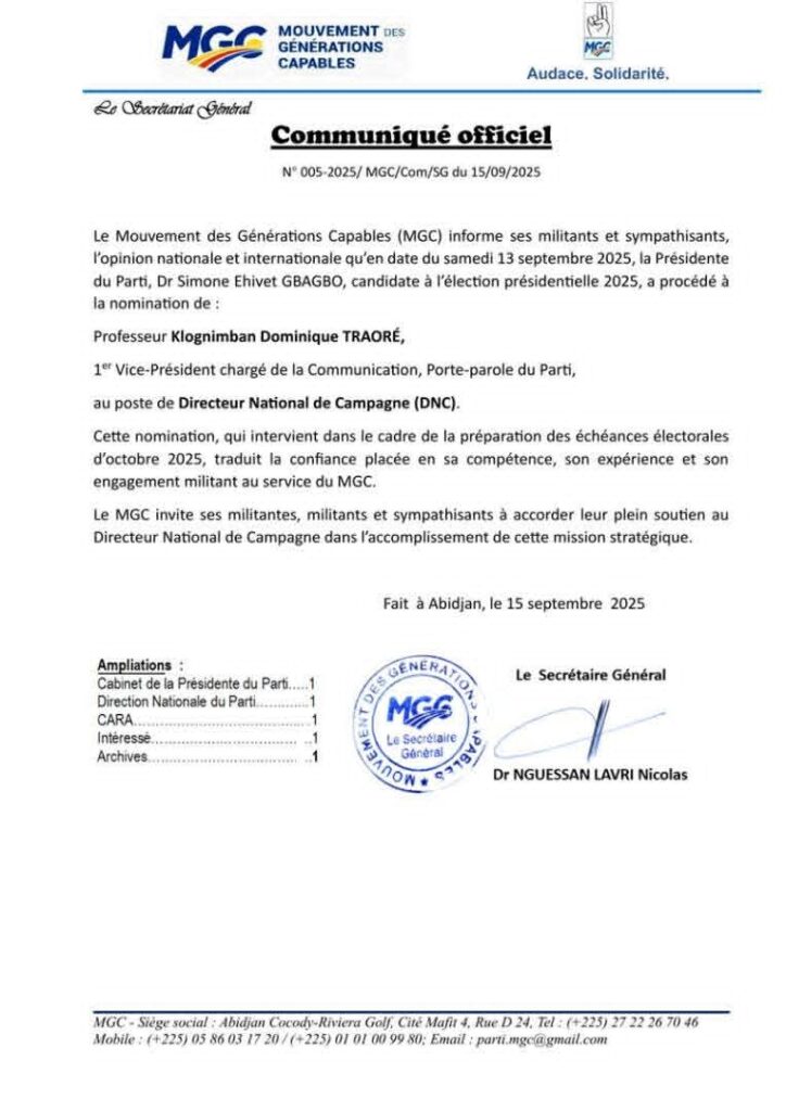 Cette décision émane de la présidente du parti, Dr Simone Ehivet Gbagbo, candidate à la magistrature suprême. Selon la direction du mouvement, cette désignation « traduit la confiance placée en sa compétence, son expérience et son engagement militant au service du MGC ».