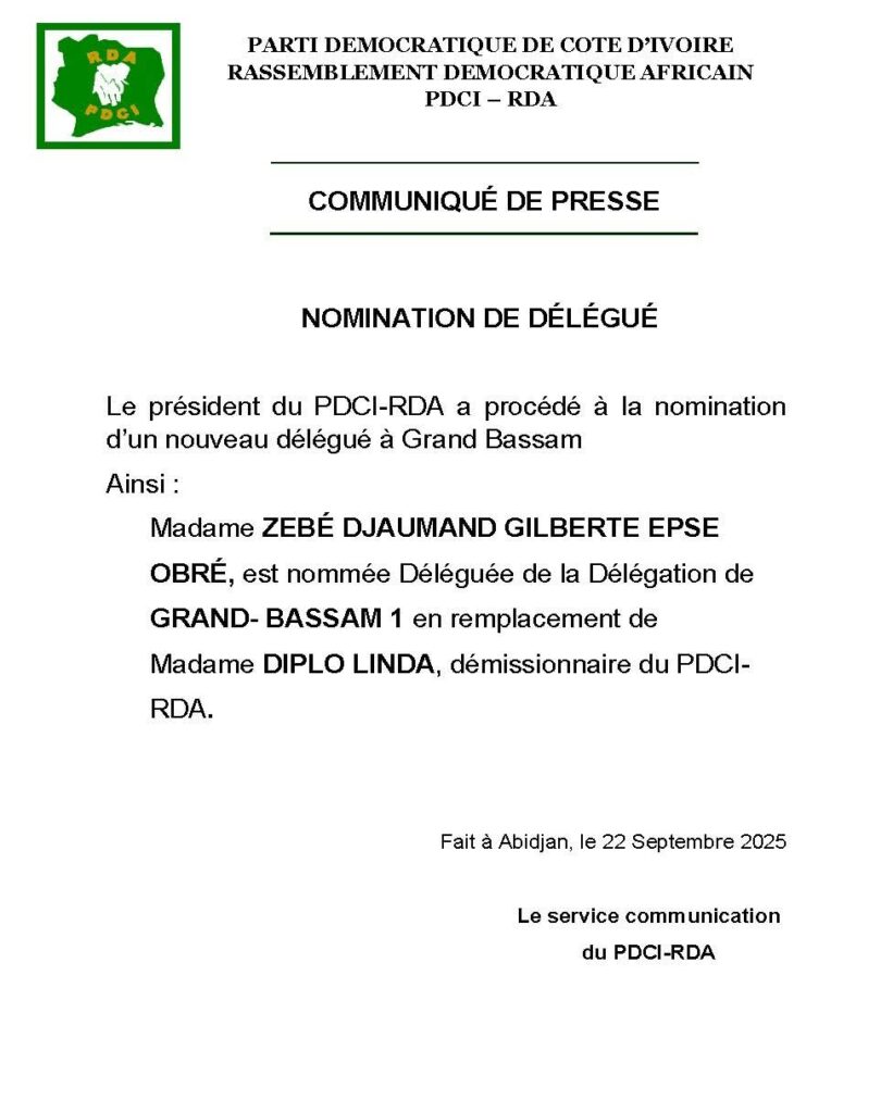 « Le président du PDCI-RDA a procédé à la nomination d’un nouveau délégué à Grand-Bassam. Madame Zébé Djaumand Gilberte épouse Obré est nommée déléguée de Grand-Bassam 1 en remplacement de Madame Diplo Linda, démissionnaire du PDCI-RDA », précise le communiqué dont nous avons reçu copie.