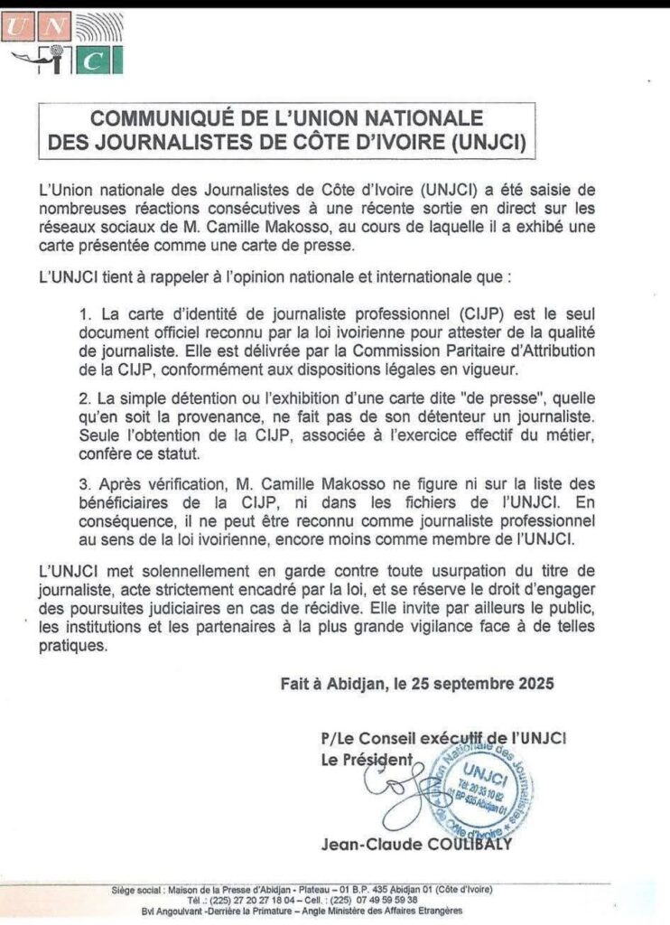 Après vérification, l’Union nationale des journalistes a affirmé que Camille Makosso ne figure ni sur la liste des bénéficiaires de la CIJP, ni dans ses propres fichiers. En conséquence, il ne peut être reconnu comme journaliste professionnel au regard de la loi ivoirienne, encore moins comme membre de l’UNJCI.