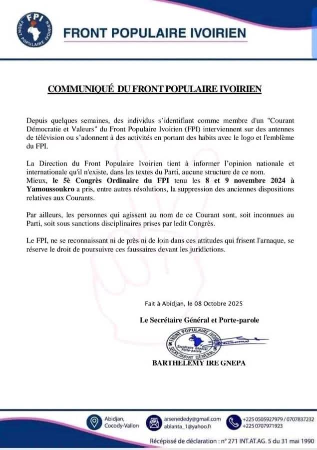 Dans un communiqué officiel signé par son Secrétaire général et porte-parole, Barthélémy Iré Gnèpa, la direction du FPI a dénoncé avec fermeté les agissements de ce courant. Selon le parti, ces individus multiplient depuis plusieurs semaines les interventions médiatiques et les activités publiques en utilisant illégalement les symboles et le logo du parti à la rose.