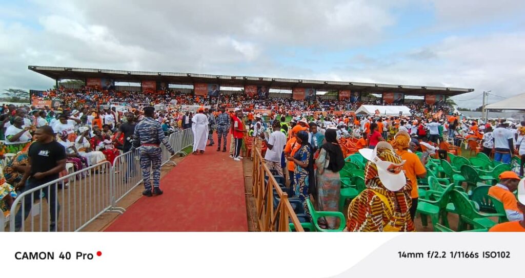 L’enthousiasme est palpable. Dès 6 heures du matin, soit plusieurs heures avant l’arrivée du Président, les militants et sympathisants du RHDP ont convergé vers le Stade Municipal de la ville. Le stade, paré aux couleurs et aux emblèmes du parti présidentiel, affichait déjà complet à la mi-matinée, offrant un spectacle impressionnant de ferveur et de mobilisation.