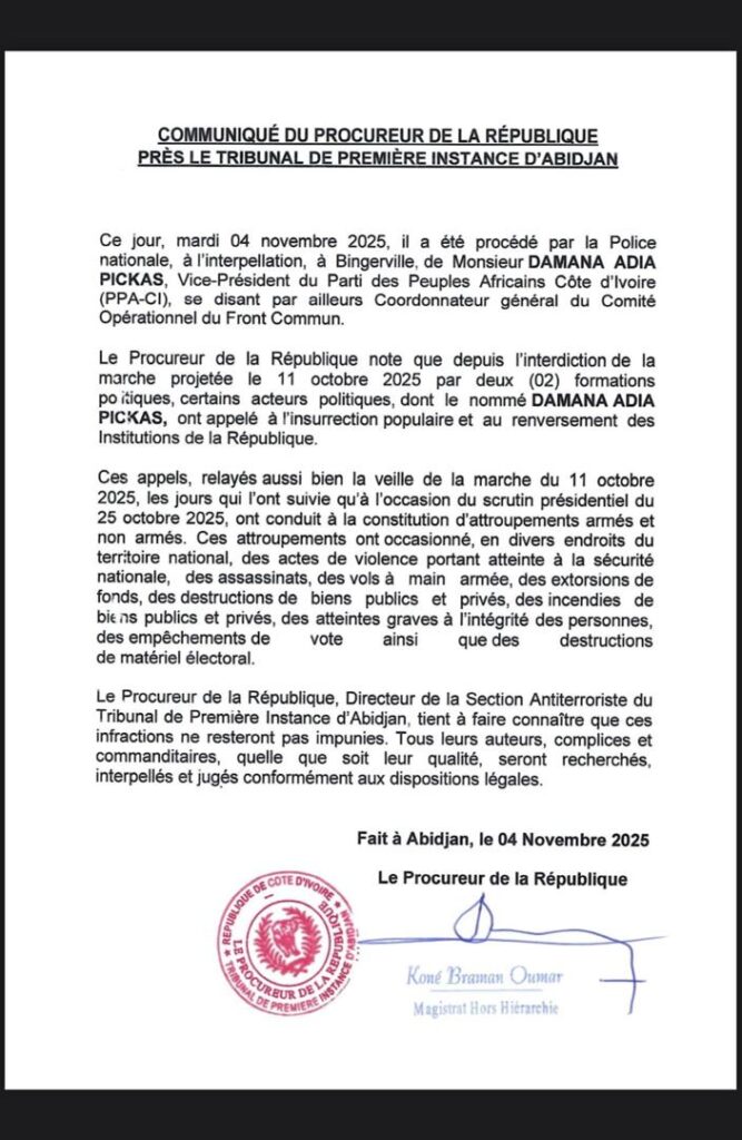 Lemandatexpress.net – Fin de cavale pour Damana Adia Pickass. Le vice-président du PPA-CI, également coordonnateur général du Comité opérationnel du Front commun, a été interpellé ce mardi 4 novembre 2025 par la Police nationale, à Bingerville.