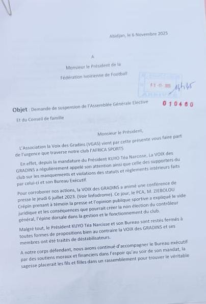 Lemandatexpress – Organe statutaire de l’Africa Sports, la Voix des gradins (VGAS) s’oppose fermement à la tenue de l’Assemblée générale élective du club vert et rouge. Une opposition matérialisée ce jeudi 6 novembre 2025 par une saisine officielle adressée à la Fédération ivoirienne de football (FIF), sollicitant la suspension pure et simple de ces assises.