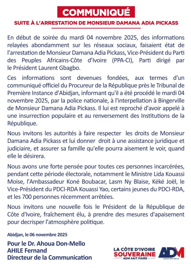 Lemandatexpress – L’arrestation du vice-président du Parti des Peuples Africains-Côte d’Ivoire (PPA-CI), Damana Adia Pickass, continue de susciter de vives réactions au sein de la classe politique ivoirienne. Dans un communiqué signé de Ahilé Fernand, Ahoua, Directeur de la Communication du Dr Ahoua Don-Mello, candidat malheureux a l’élection présidentielle de 2025, demande aux autorités de garantir le respect des droits de Damana Adia Pickass, arrêté mardi 4 novembre 2025 à Bingerville.