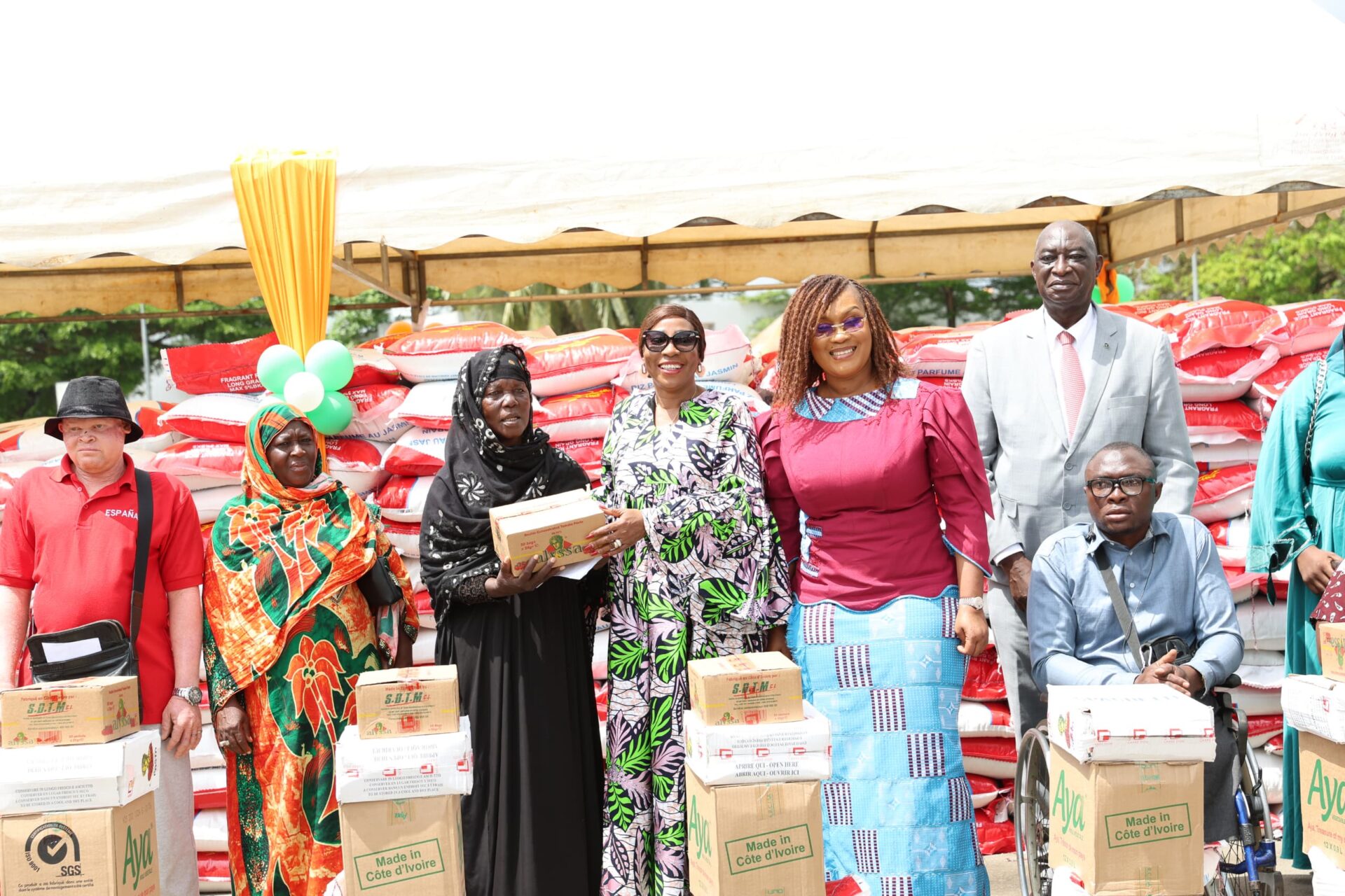 Mme Anka Kouleon, cheffe de cabinet au ministère de la Cohésion sociale, a procédé à la remise d’un don composé de 1 000 sacs de riz de 22 kg, 100 cartons d’huile, de tomates, de pâtes alimentaires, de spaghetti, ainsi qu’une enveloppe financière d’un million de francs CFA, pour une valeur totale de 3 150 000 F.
