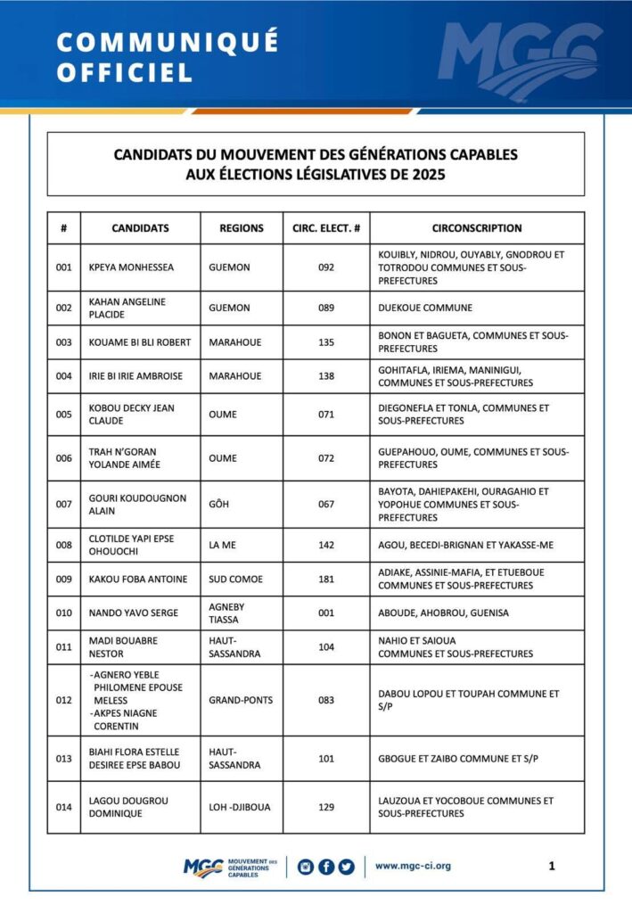 Législatives 2025 : Le MGC aligne 14 candidatures dans 10 régions, sans Simone Gbagbo