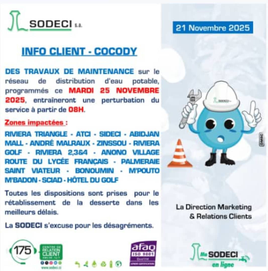 Tout en présentant ses excuses pour les désagréments, la SODECI assure avoir pris toutes les dispositions nécessaires pour un rétablissement rapide de la desserte.