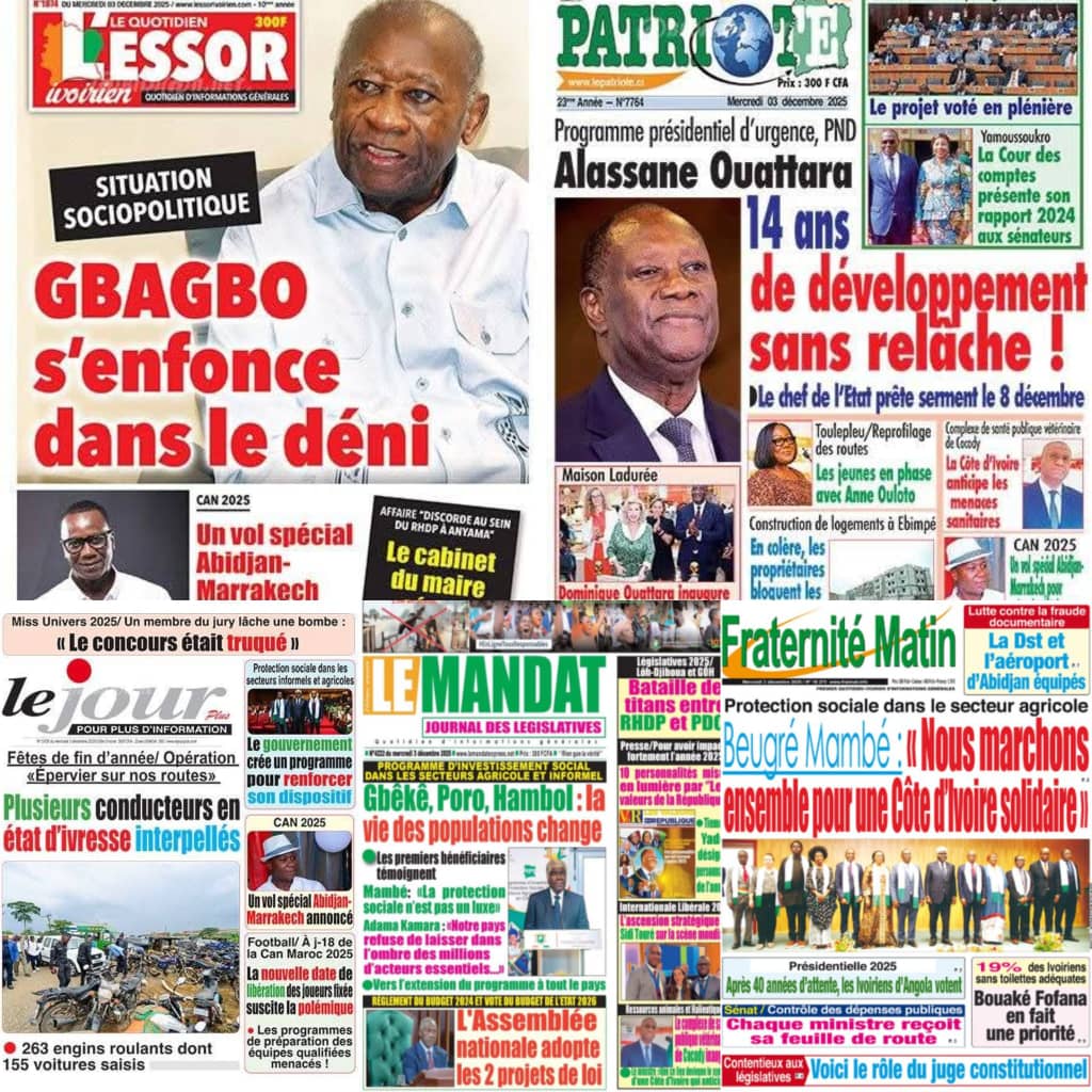 Lemandatexpress – La scène politique ivoirienne offre ce mercredi 03 décembre 2025, un panorama contrasté, oscillant entre bilans gouvernementaux, enjeux sociaux, tensions locales et manœuvres en coulisses. De la presse proche du pouvoir aux titres plus critiques, les journaux dressent une cartographie précise des dynamiques en cours, alors que les législatives 2025 s’approchent et que les débats publics s’intensifient.